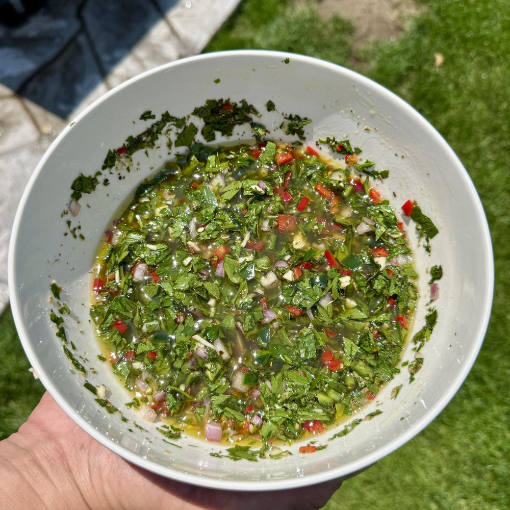 Fresh, bold, and irresistibly tangy — this Argentine-style chimichurri is the ultimate grilling sidekick. Made with vibrant herbs, zesty vinegar, and Cuso’s all-natural Grass and Gravel seasonings, it’s the kind of sauce that instantly takes steak, chicken, seafood, or even roasted veggies to the next level. Whether you’re hosting a weekend BBQ or just want to add a punch of flavor to a weeknight meal, this chimichurri brings authentic taste with minimal effort.