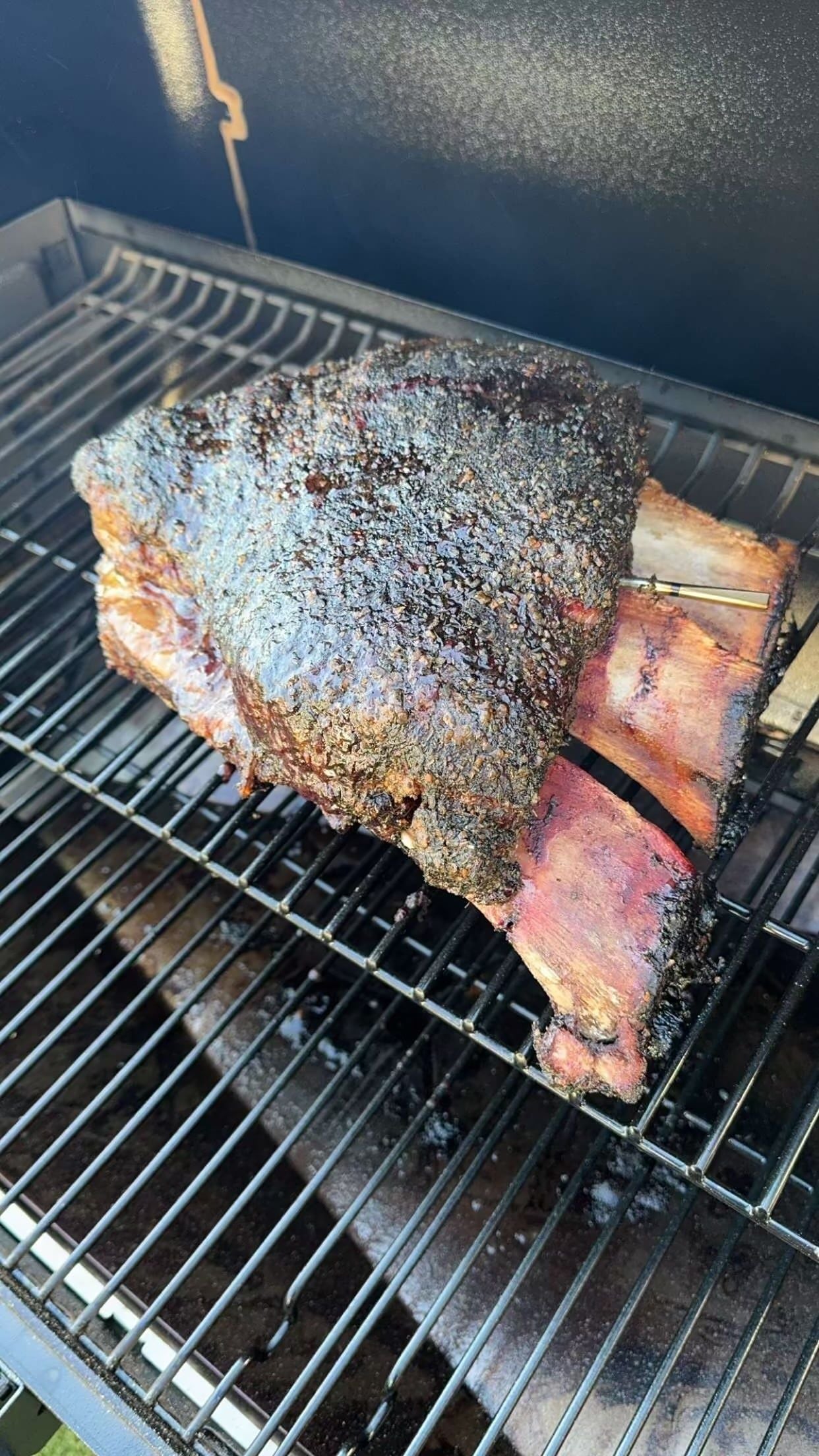 6. When the internal temperature of the beef ribs hits 150°F (5-8 hours), crank the smoker heat up to 275°F to finish.